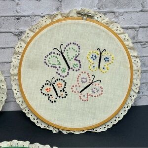 Butterflies Flower Needlepoint Handmade Art Framed Ruffles 3 Pieces Vintage