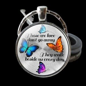 Silver keychain featuring colorful butterflies and an inspirational quote