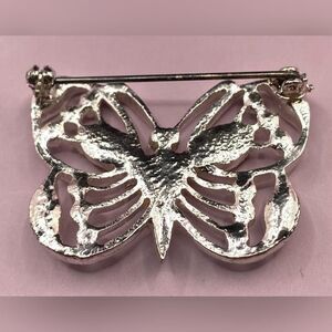 Costume jewelry piece with a whimsical butterfly motif; great for jackets, scarves, or bags.