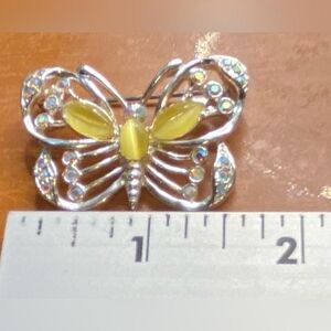 Butterfly Brooch Pin Silver Tone Yellow Cabochon Aurora Borealis Rhinestone 1.5"
