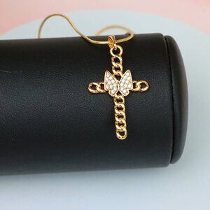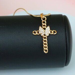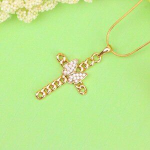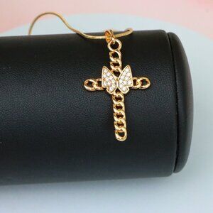 This elegant pendant features a cross made of chain links with a sparkling butterfly centerpiece, combining faith and fashion in a modern rose gold design.