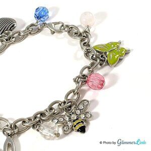 Silver tone garden themed charms bracelet featuring a cable style chain accented with faceted beads, round beads and six charms.