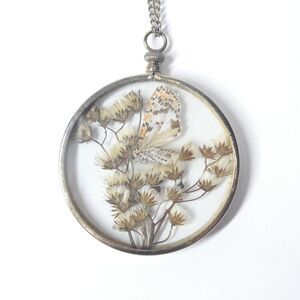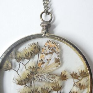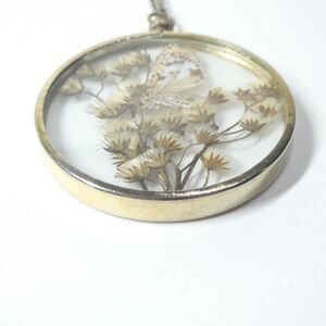 Vintage necklace featuring a large round glass pendant encasing a real butterfly and dried flowers. 2 inch diameter pendant on 19 length chain. Some surface wear to the metal, but still displays well.