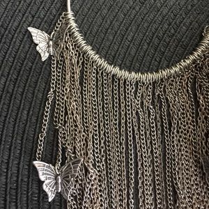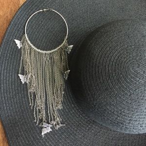 Beautiful Silver tone big hoop earrings. The are adorn with different length chain as well as butterflies 🦋. Must have strong 💪 earlobes because they do have a little weight. Never worn. No tarnishes or fading