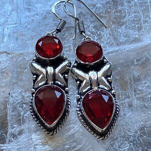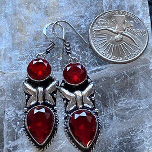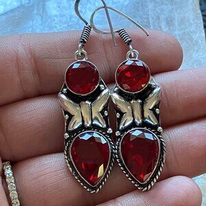Earrings of faceted red garnet stones with butterflies, in 925 silver plated settings, with ear wires.