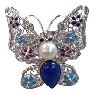 Elevate your jewelry collection with this exquisite butterfly design ring, featuring sterling silver craftsmanship adorned with vibrant lapis and pearl accents. The intricate detailing and colorful enamel flowers make it a standout piece, perfect for adding elegance and charm to your style. Ideal for those who appreciate unique and artistic jewelry pieces.
