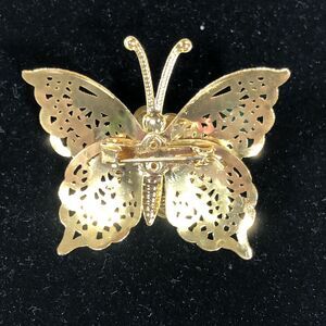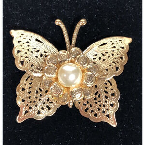 Butterfly Gold Tone Brooch Pin Filigree Style Faux Pearl Flower Unsigned Vintage
