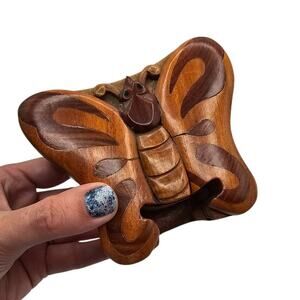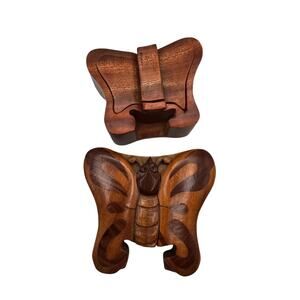 Discover the charm of this handcrafted wooden secret jewelry puzzle box! Its intricate design features a beautiful butterfly motif, making it a delightful addition to any collection. The red velvet interior adds a touch of luxury, perfect for safeguarding your precious jewelry or small treasures. This unique piece combines artistry and functionality, offering a fun and engaging way to store your valuables. It's not just a box; it's a conversation starter! Makes a great gift!