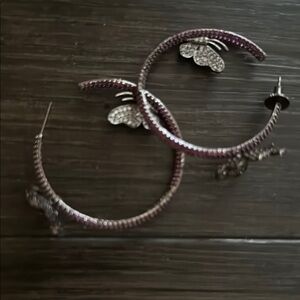 Charming hoop earrings featuring a butterfly design. Adorned with purple and silver details.