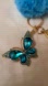 Charming blue butterfly keychain with a fluffy pom pom. Features gold accents and a heart-shaped clasp.