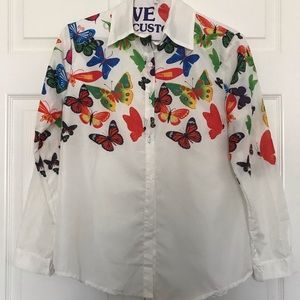 White long sleeved shirt with multicolored butterflies on top of front and sleeves. Size large. Light weight polyester. Pre-owned, VGUC.