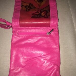 Butterfly & Lady Bug Handmade Embossed Pink Softened Leather Purse. Adjustable Cross Body Straps. Multiple outer zippered compartments. Some inner pockets. The exterior and interior are both in very good condition
