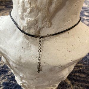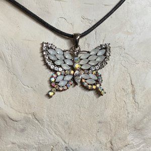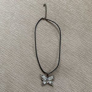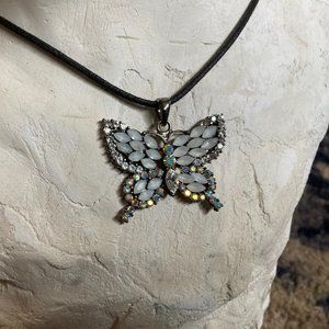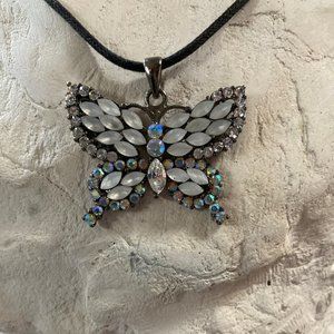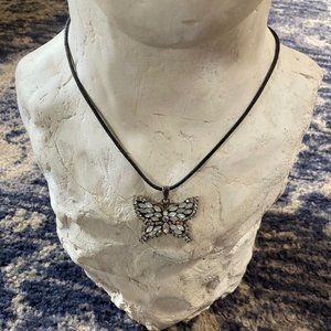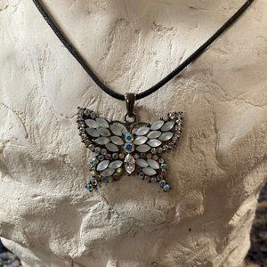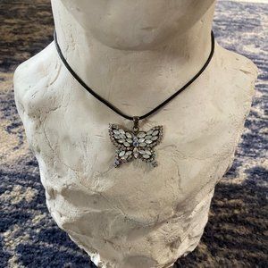 Selling this butterfly necklace with crystals and a leather cord. The length is 18 inches from end to end. Can wear as a necklace or shorter as a choker.