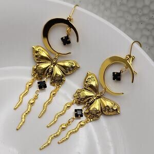 Golden butterfly earrings with polished onyx stones, dangling snakes, crescent moons, and stainless steel hooks.