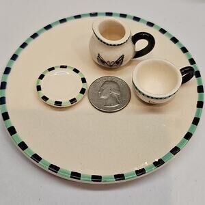 The set comes complete with a tiny teapot, two cups and saucers, a cream and sugar bowl and a small tray on which to carry or display this lovely little service.