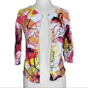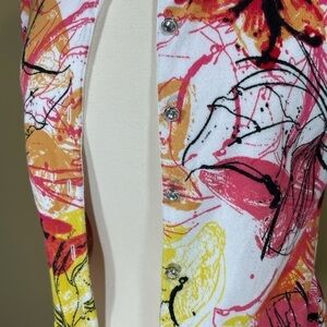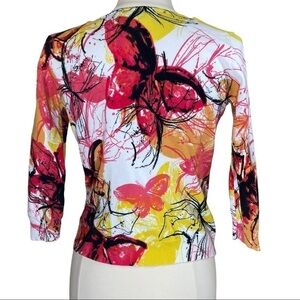 This medium weight button down cardigan features rhinestone buttons and stylized butterfly artwork through its vivid pattern in hues of orange, pink, yellow and black.
