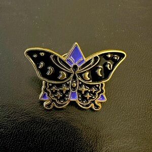 Brand new celestial black butterfly pin with purple triangle background approx 1”