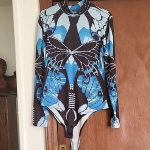 Embrace elegance with this stunning butterfly print bodysuit. Featuring a chic black and blue design, it's perfect for making a statement. SOLD OUT online