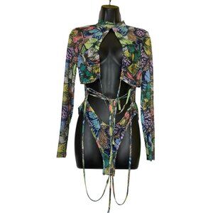 Butterfly Print Mesh Sexy Long Sleeve Bodysuit Open Front Ties Large Stretch Hot