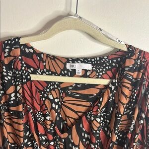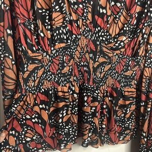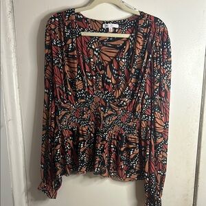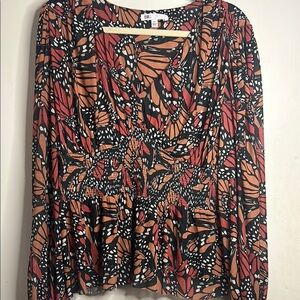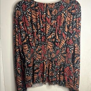 Make a statement in this eye-catching butterfly print blouse. Features a flattering V-neckline, elegant long sleeves, and a feminine peplum silhouette. The vibrant orange and black butterfly pattern creates a stunning visual effect, perfect for both casual and dressy occasions.