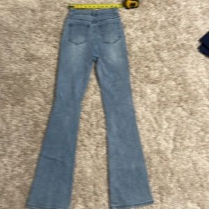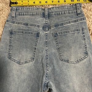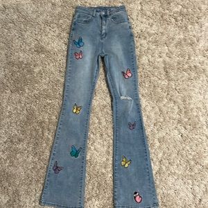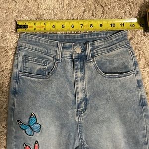 Super cute light wash jeans with colorful butterfly appliqués down the front. Ripped knee. 33” inseam, ~24” waist buttoned.