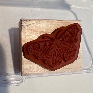 Butterfly-themed rubber stamp ideal for adding intricate designs to greeting cards, scrapbooks, and DIY crafts. Durable wood mount ensures precise use.