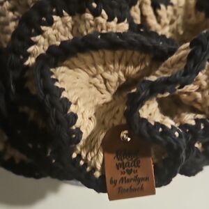 Stylish crochet hat in black and cream, perfect for adding a unique touch to any outfit.