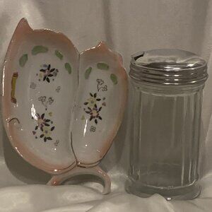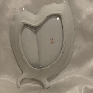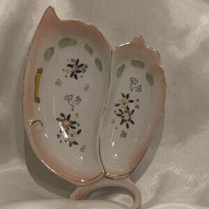 Butterfly Shape Divided Pin Tray or Dish. 6" Vintage. Made in Japan. No damage or repairs except for some wear to the gold. Unsure what the scroll sticker is about. Porcelain.