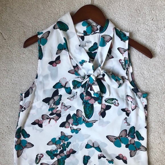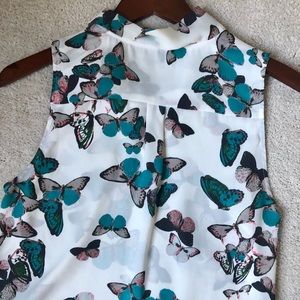 Sleeveless butterfly print blouse with neck tie for a beautiful detail. No zipper, a maple enough to pull over. Size Small.