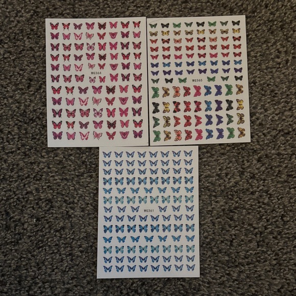 Set of three butterfly sticker sheets in pink, multicolor, and blue.