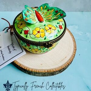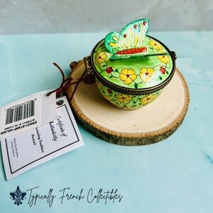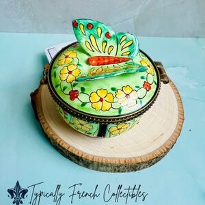 This is a gorgeous and whimsical stamp holder trinket box. Made by Kelvin Chen in 2002. It is numbered 4056. This is a very unique trinket box and features gorgeous floral accents. A very unique trinket box! Beautiful trinket box to use as a stamp holder or to put on display. The details are gorgeous including a cute butterfly on top! Perfect for trinket box enthusiast. An excellent addition to any collection!
