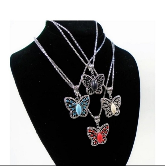 Beautiful butterfly pendant 20" silver chain necklace with stone center and gems throughout. Choice of stone color: cream, black, red, teal.