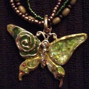 Butterfly necklace with matching earrings - colors: green, brown, gold - multiple clasp options to make it longer or shorter