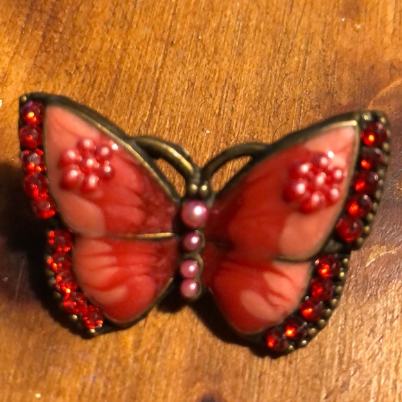 Butterfly pin with bright red stones and designs in shades of pink