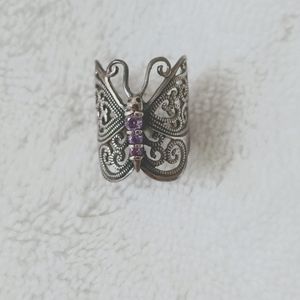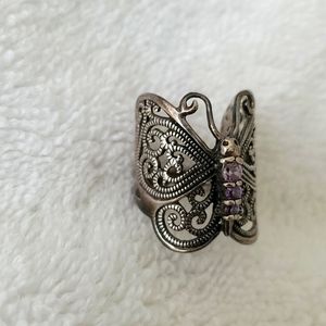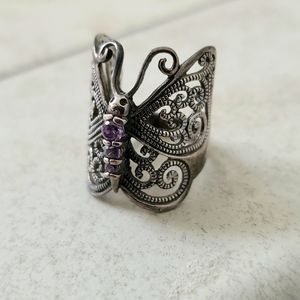 silver tone butterfly ring with purple stones. size 6.