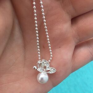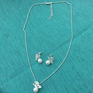 Adorable silver toned butterfly necklace and earrings set. Faux pearl and clear rhinestones. Chain is about 18” plus an additional 2” extender. New in package.