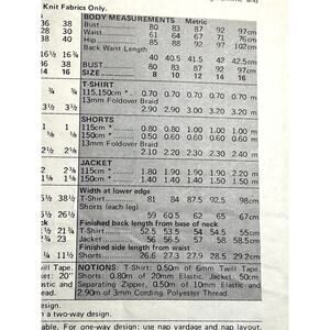 Fitted T-shirt has 'U" neckline, cut-away armholes and fold over braid trim. Shorts have elasticized waistline, shaped hemline and fold over braid trim. Semi-fitted jacket has self lined hood, purchased drawstring neckline, exposed front separating zipper closing, purchased drawstring hemline and full-length sleeves elasticized at wrists.