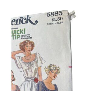 This vintage Butterick 5885 sewing pattern features three blouse variations (A, B, C) with loose fits, including neckline ties, button closures, and elasticized or flared sleeves. Includes 5 cut pattern pieces.