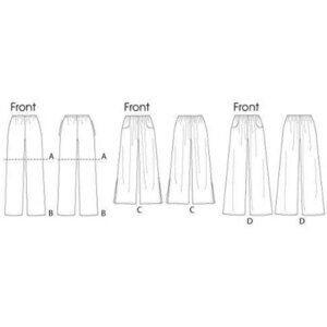 Loose-fitting shorts or pants have elasticized waistband, pocket variations and narrow hem. A and B: straight-legged, cut on crosswise grain. C: side slits. C and D: flared. Designed for light weight woven fabrics. NOTIONS: 11/4 yds. of 3/4" Elastic. FABRICS: A,B: Border Prints. C,D: Challis, Georgette, Linen, Faille. Unsuitable for obvious diagonals. Without Nap.