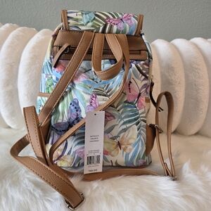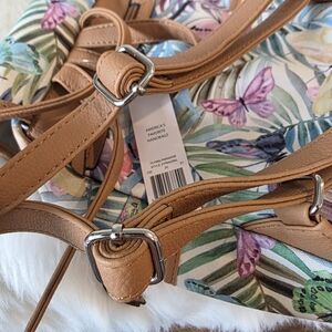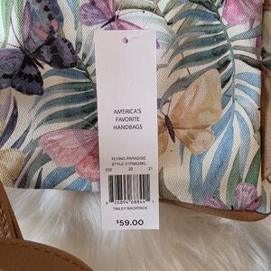 This stylish butterfly print backpack features a vibrant multi-color design, perfect for adding a pop of color to any outfit. Ideal for everyday use, it combines fashion with functionality. New with tags. Approx 10" x 8" x 5".
