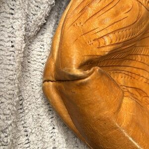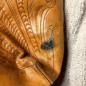 Buttery Soft Hand tooled Vintage Leather Shoulder Bag - 2 Zipper Sections Lined with/Boho Fabric - SEE PICS FOR CONDITION - Ink imperfection on one side and on top of zipper sections - Great size for a Tote! This is a bag you can’t wear out- it just keeps getting softer!!!
