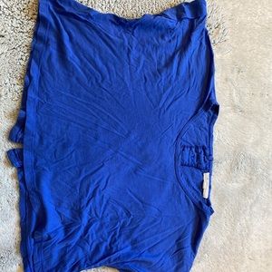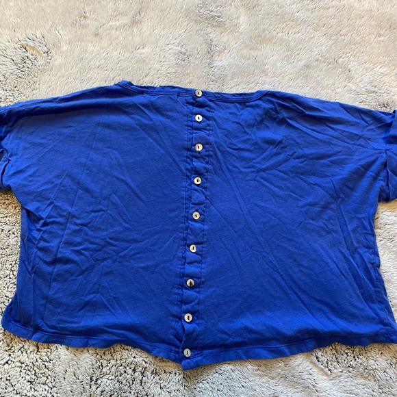 Bright blue long crop top ( on me 5’0). Back of buttons, great everyday shirt or a workout shirt.