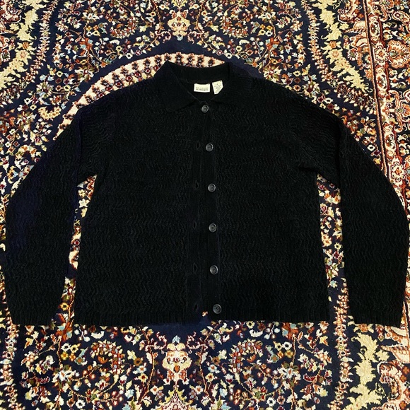 Adorable black cardigan that buttons up with a collar! Cute squiggly design that is noticeable closer up (pictured)