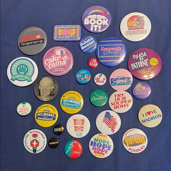 A big assortment of buttons some are advertising some are just a saying, just a picture, and a couple political. 29 in total. Some in good condition some in very good condition in a variety of sizes.