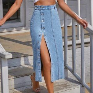Button Front Longline Denim Skirt
