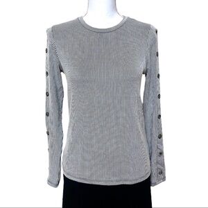 Black & white long sleeved striped Urban Romantics top in a rayon/poly/spandex blend with button detail down each sleeve, size S. Like-new condition!