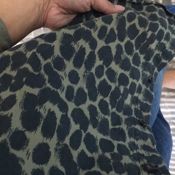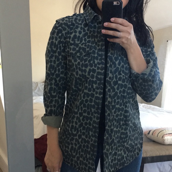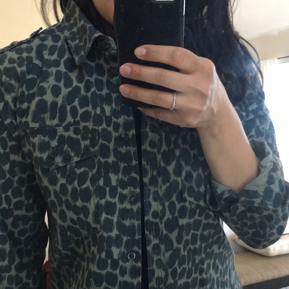 Spotted button down, structured, flattering. Perfect condition, never worn. Very low key khaki green, black "spots"