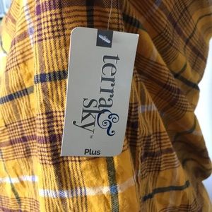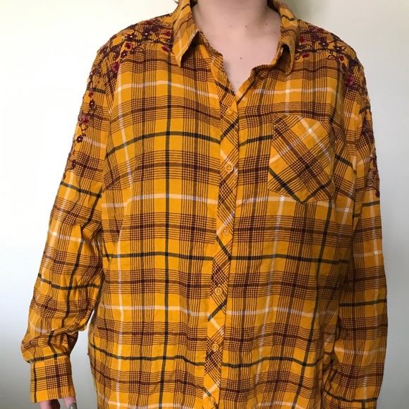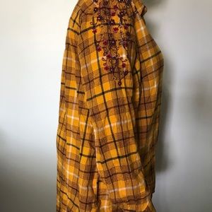 Terra sky button down. Floral stitching.