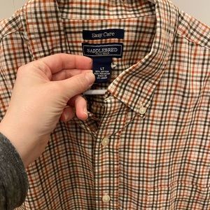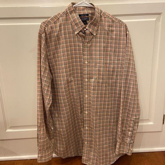 Great condition; brown, orange, white plaid, size L Tall