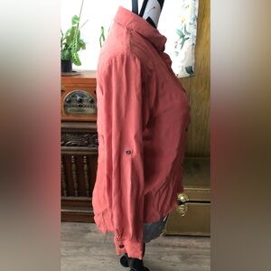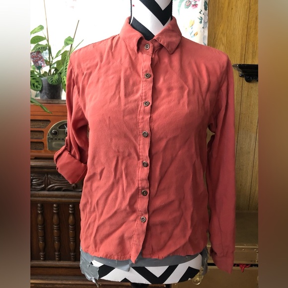 Flowy burnt orange button down. Metal buttons, rolled sleeve strap, great condition.